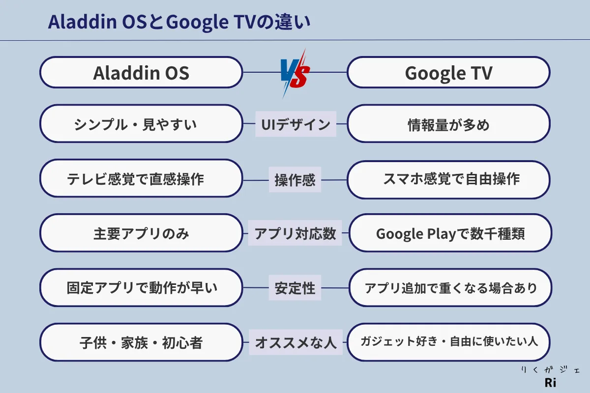スマホのように自由度の高いGoogle TVに対して、Aladdin OSは『テレビのリモコン感覚でパッと使える直感的な操作性』が魅力。