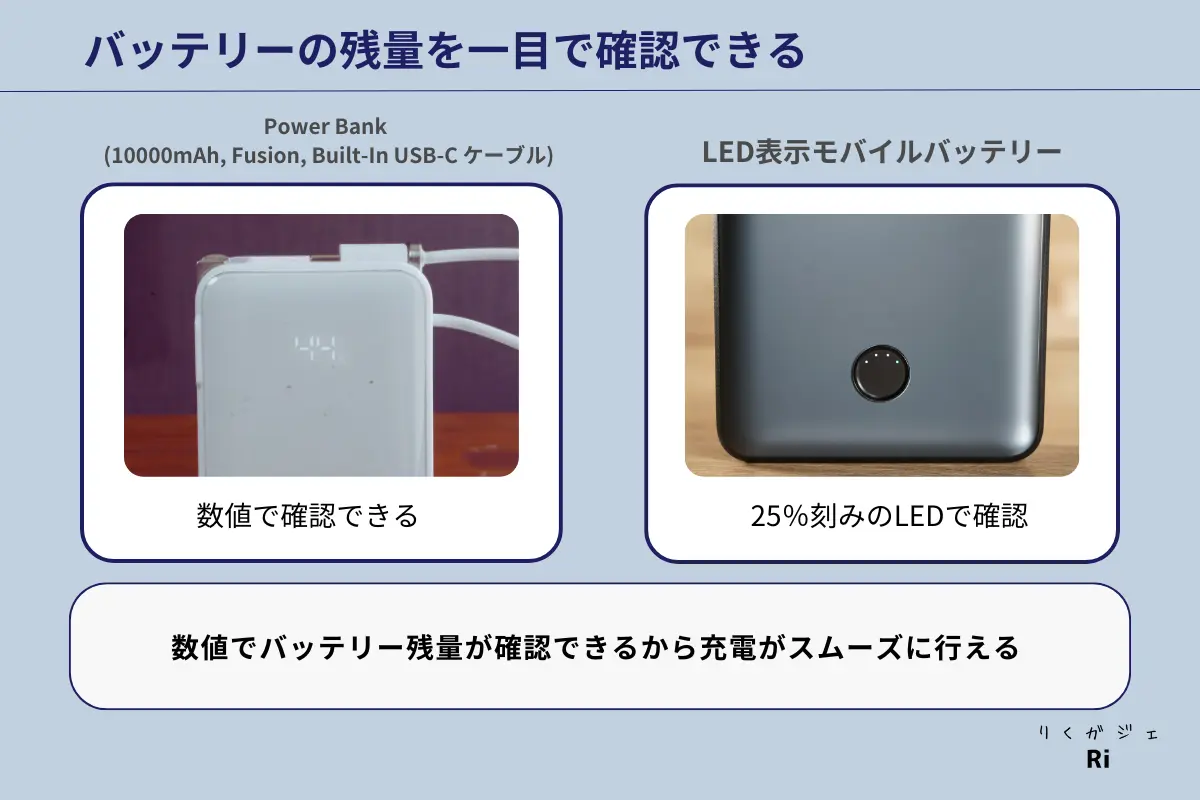 Power Bank (10000mAh, Fusion, Built-In USB-C ケーブル)は、残量ディスプレイを搭載しているため、充電のタイミングが分かりやすいです。