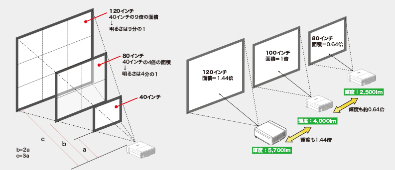 しかし、スクリーンサイズが大きい場合は、光が広範囲に広がるため、より多くのルーメン数が必要となります。